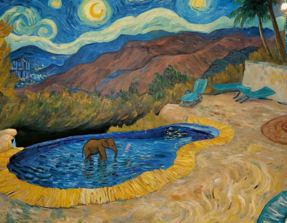We loved her, and she absolutely loved the swimming pool. It was one of those zero-edge masterpieces, and she would just float, bobbing along with her trunk draped over the side, not a care in the world. Luckily the masterpiece had a top-of-the-line salt-water generator, so we raided Home Depot for dozens of bags of salt and thought we could probably keep the thing going until 2075.